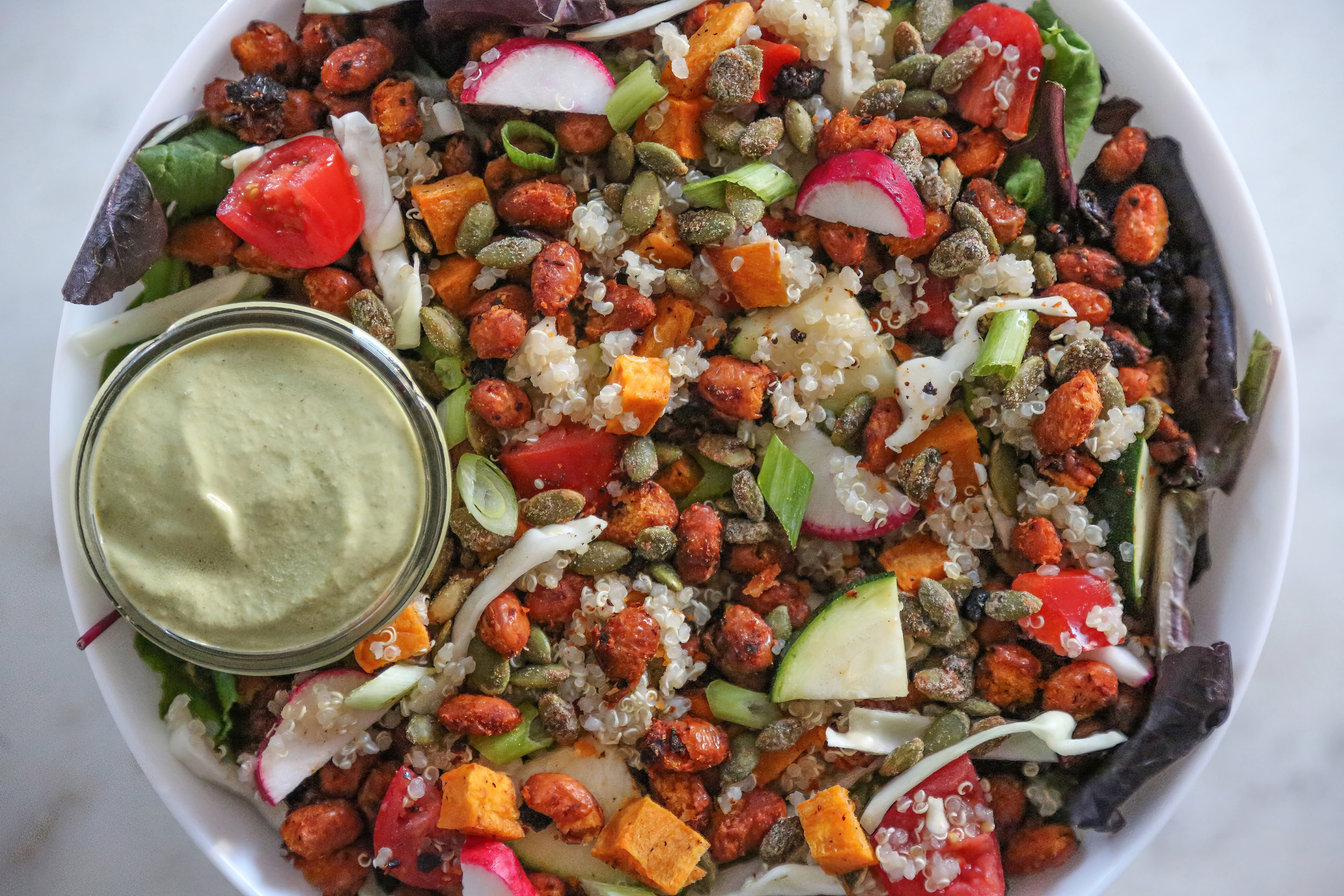 Our creamy sunflower seed-based vegan ranch filled with herbs. We love this as a veggie dip, salad dressing, or spread on a veggie burger or wrap. Grab it when it appears on our weekly menu! -