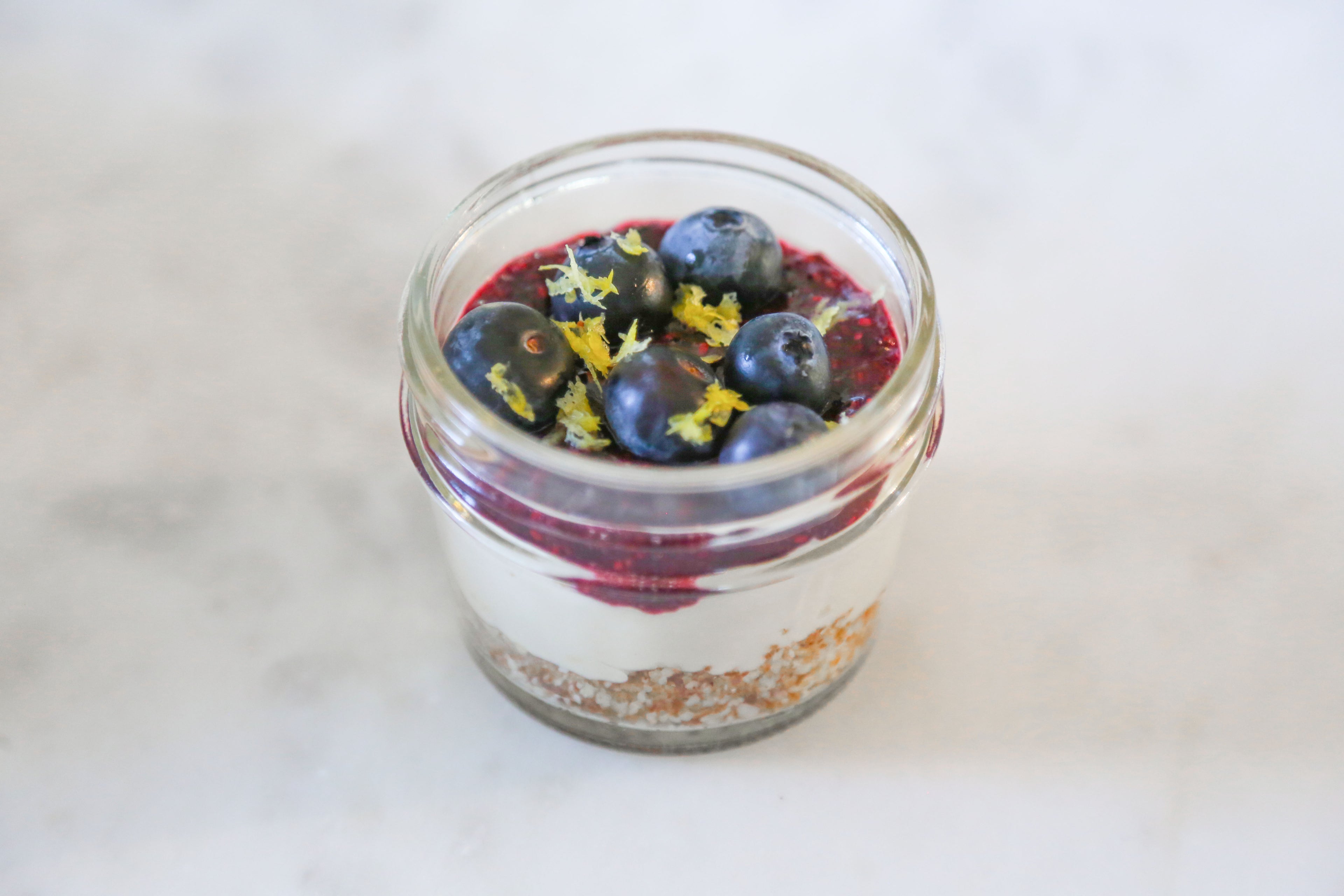 An almond date crust is topped with our cashew-based lemon cheesecake sauce with added pea protein, blueberry chia jam, fresh blueberries, and lemon zest.
