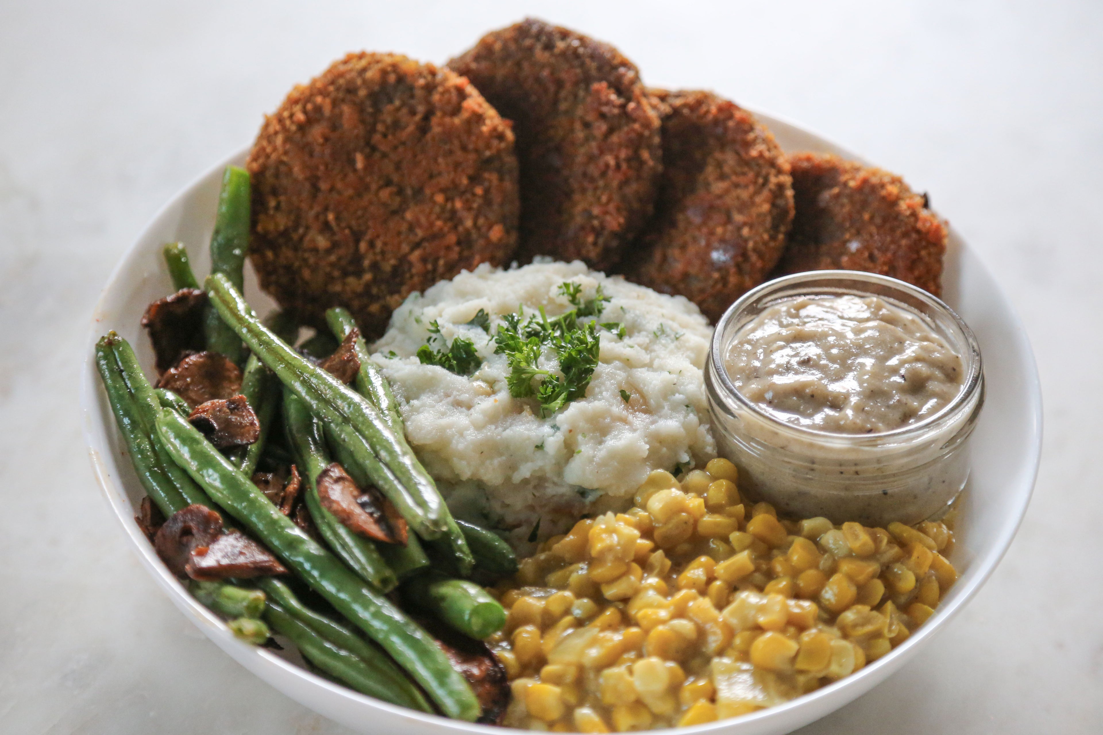 This new comfort food meal would be a perfect choice to bring to a family gathering, or enjoy on a cozy night at home! Includes mini versions of our cornflake-breaded Crispy Chickpea Patties, buttery creamed corn, garlic herb mashed potatoes, white pepper gravy, and crisp green beans tossed with smoky roasted mushrooms.