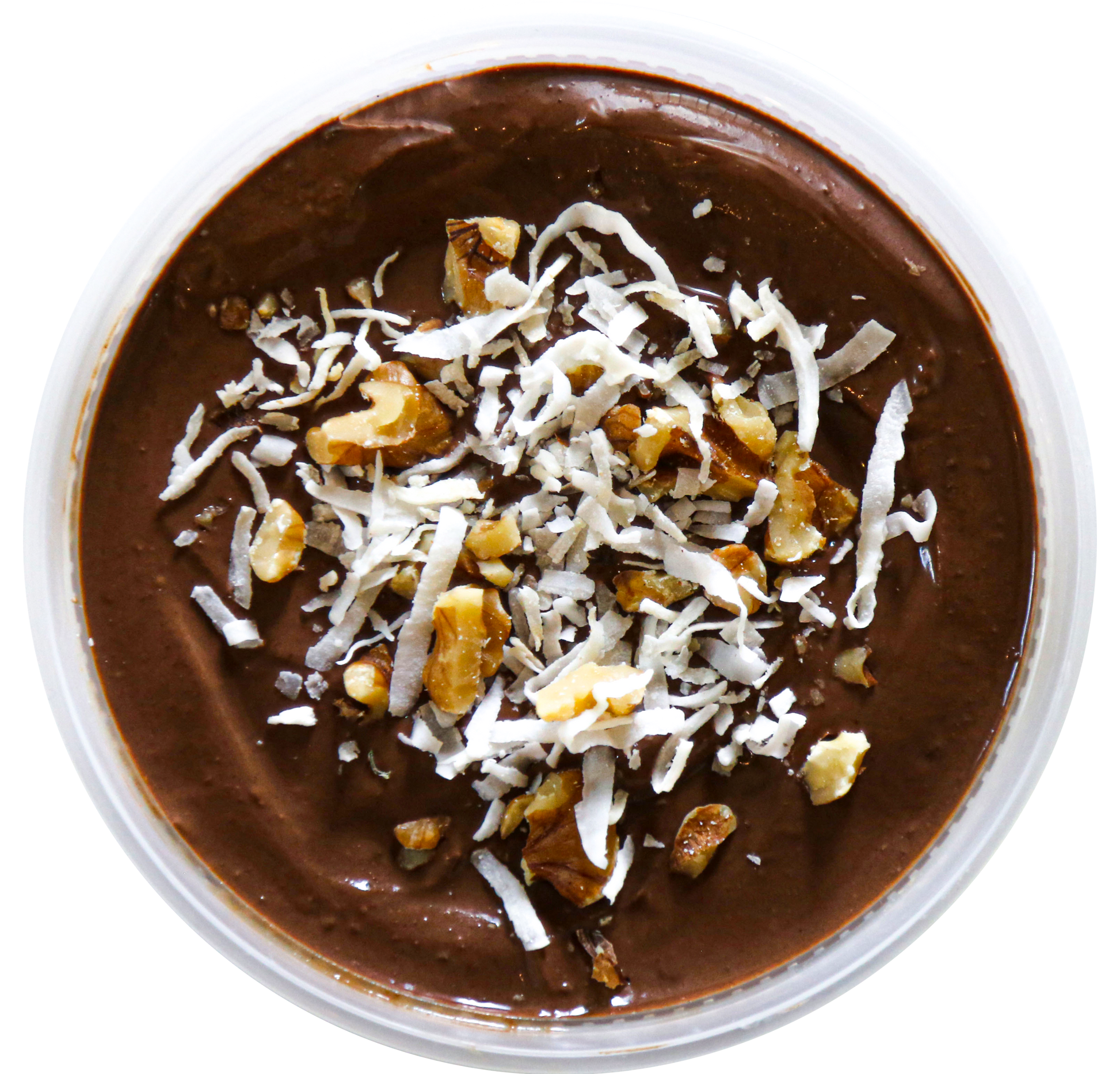 This decadent dairy-free dessert cup has a walnut-date crust topped with coconut-date caramel and vegan dark chocolate pudding, topped off with coconut shreds and chopped walnuts.