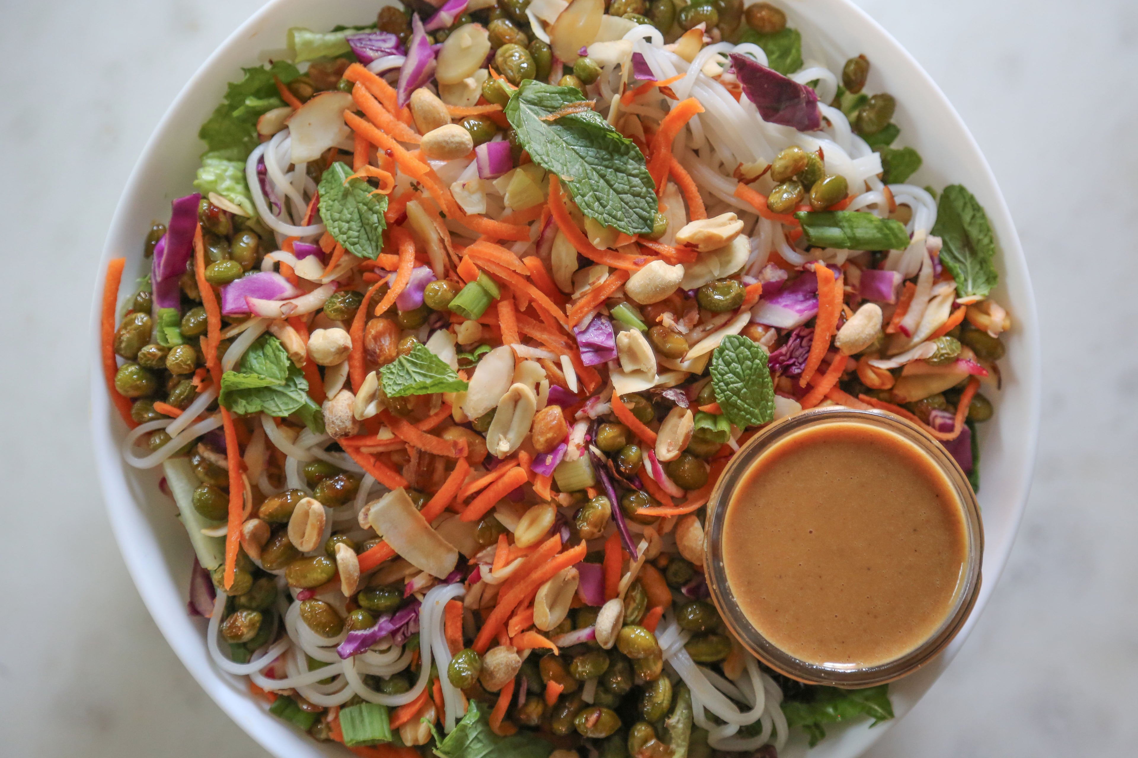 This popular chilled rice noodle salad includes sweet chili roasted edamame, cabbage, carrot, radish, green onion, fresh mint, toasted almonds, roasted peanuts, toasted coconut, all over a base of mixed greens, with a peanut dressing on the side.