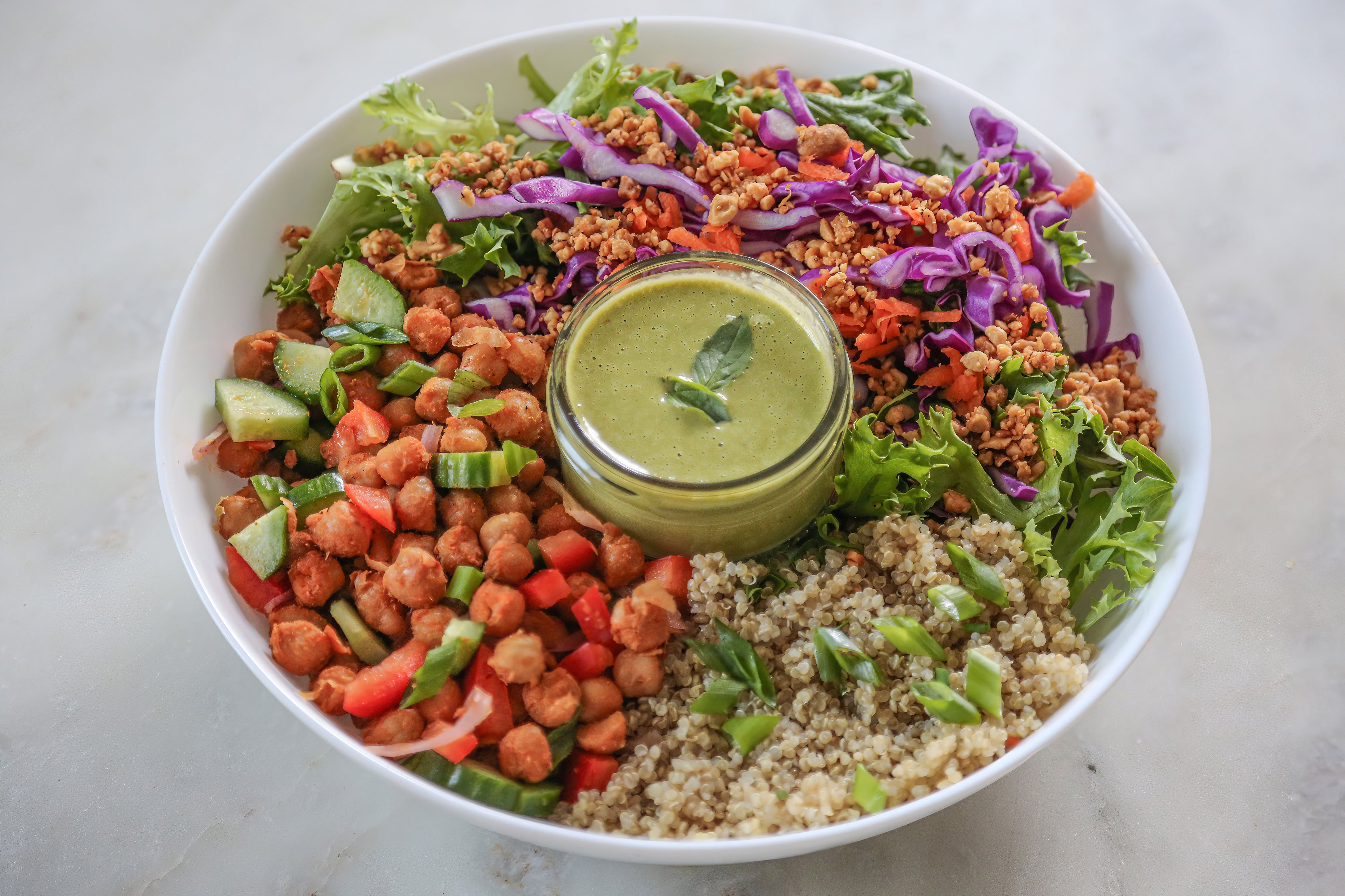 This salad is packed with Thai curry-inspired flavor! Mixed greens, red curry roasted chickpeas, quinoa, chili lime crushed peanuts, shredded cabbage & carrot, cucumber, red bell pepper, pickled shallot, scallions, and a savory Thai basil dressing.
